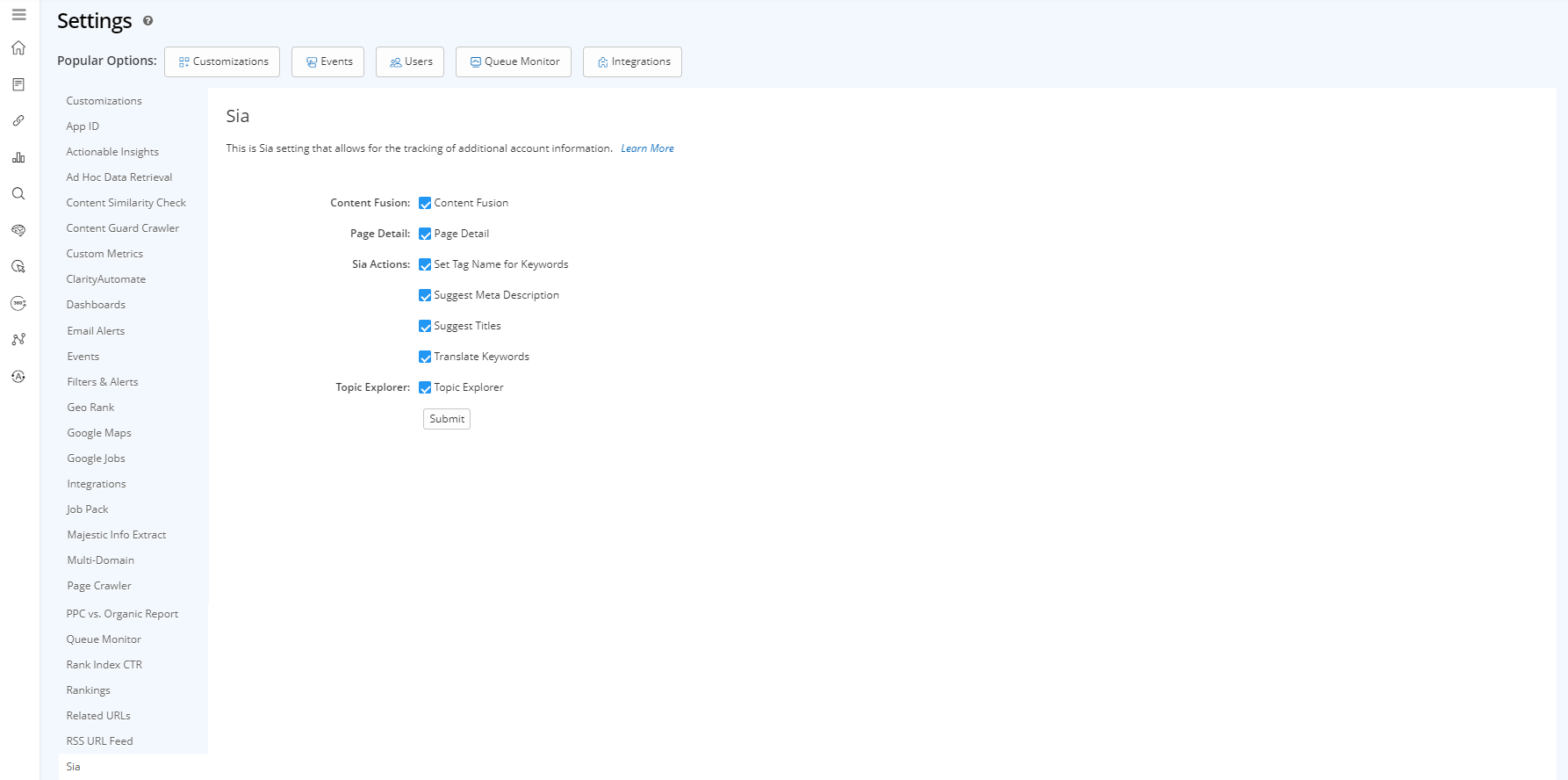 To use Sia in the seoClarity platform, it must be enabled via Settings for each corresponding feature. Admins are the only users who can enable or disable Sia for the domain. Once enabled Sia icons will be present in their respective feature and can be selected for
