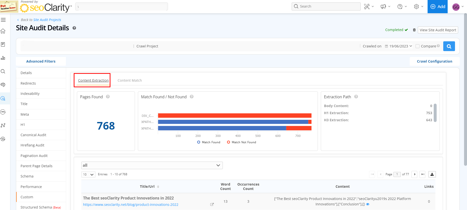 This tab will display details for any custom search that was setup for the crawl. This report consists of 2 tabs: Custom Extraction and Content Match.