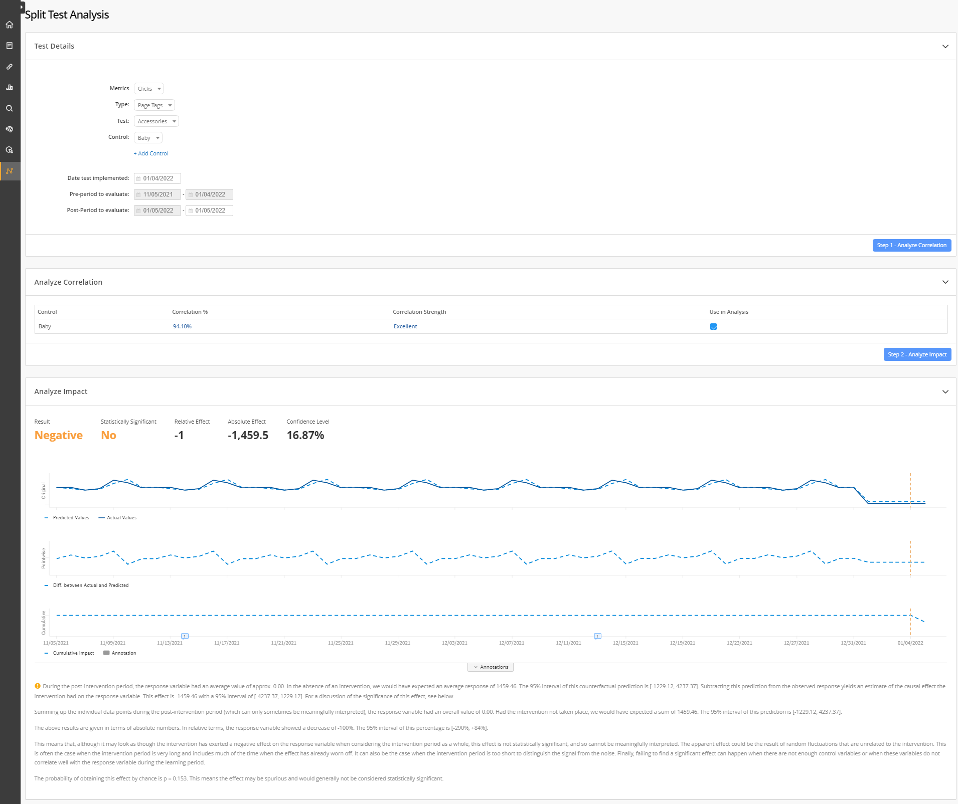 Once the inputs for: Metric, Type, Test, and Implementation Date are selected via the Test Details section, select the Analyze Correlation button to view the correlation analysis and the subsequent Analyze Impact button to view the impact analysis. Metric selection is based on Google Search Console and/or analytics integration.