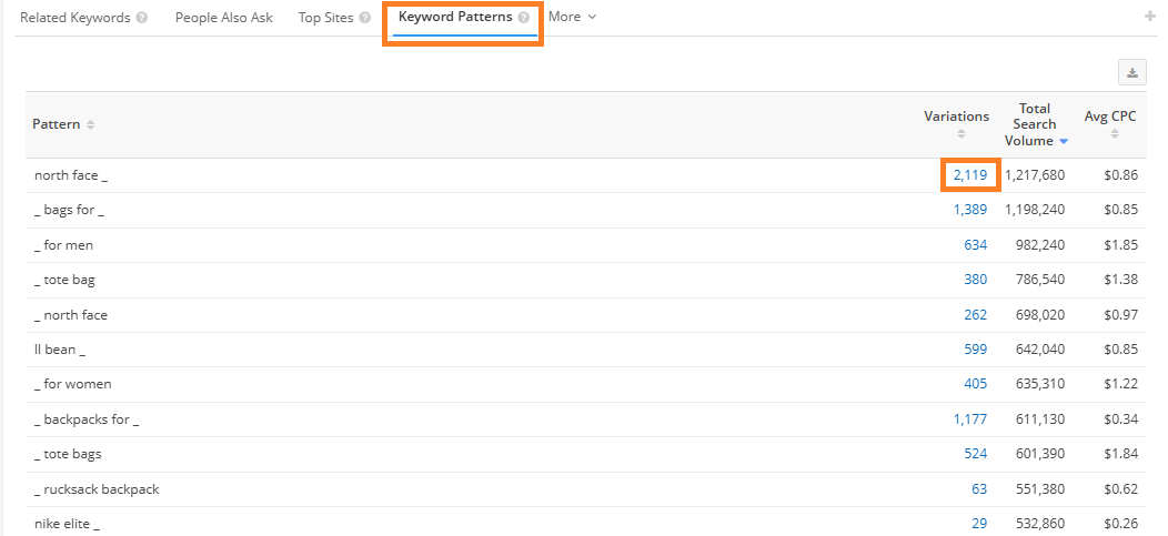 Shows common patterns of keyword phrases from the relevant keywords found. An underscore on either side of the phrase indicates other word or words appear before or after the phrase. For example, "north face_" could represent "north face backpack" or "north face borealis."