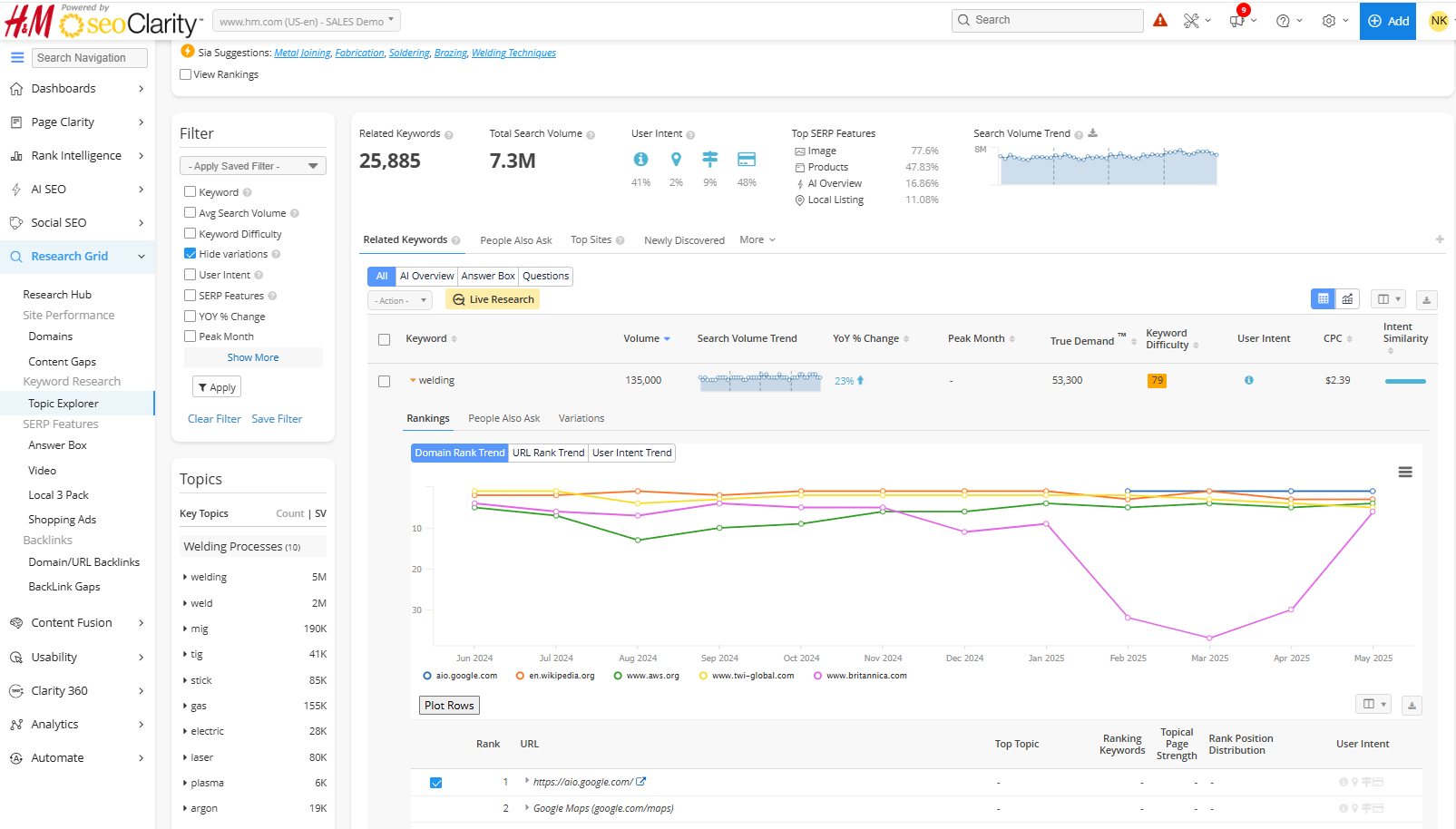 To begin viewing data in Topic Explorer, simply search for a keyword to view related metrics. Topic Explorer uses multiple data sources including: Research Grid and clickstream data. Research Grid contains 300+ million keywords and is seoClarity’s proprietary dataset for competitive research including Top 100 rankings, search volume, CPC and our own calculation of Search intent. This dataset is curated and continuously maintained by our editorial team. The clickstream dataset contains 28+ billion keywords and growing and is a proprietary dataset consisting of the actual searches conducted by users across 170+ countries. It is GDPR compliant (no Personally Identifiable Information (PII) data) and collected from all devices, with search volume estimates generated by our statistical models.