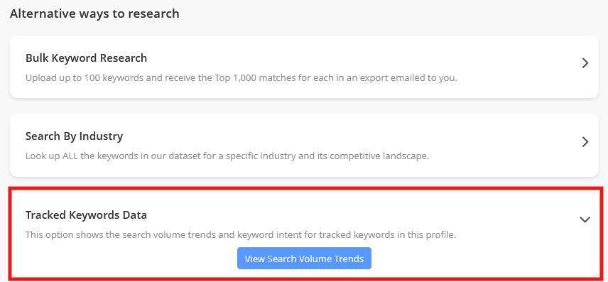 View Search Volume Trends: Selecting this option will show the search volume trends for your tracked keyword set in the domain profile that you are viewing.