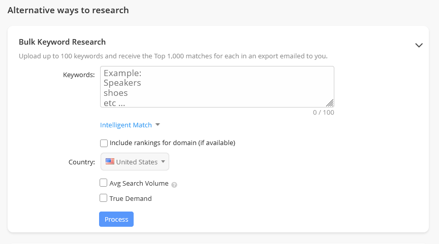 Keywords: Enter up to 100 keywords in the text field to return 1000 results per each keyword along with it's search volume.
