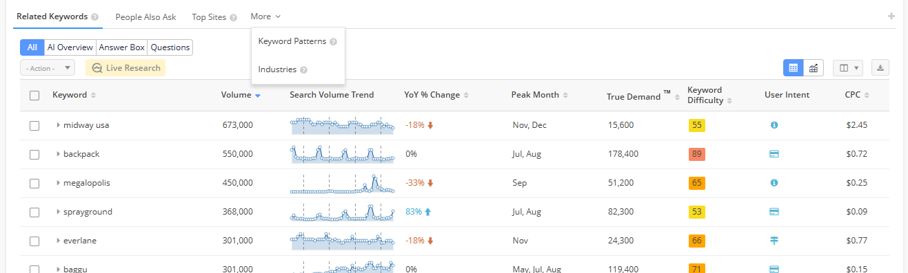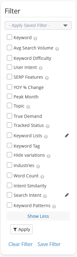Keyword Patterns: Allows for filtering of keyword patterns that are based on the searched keyword.