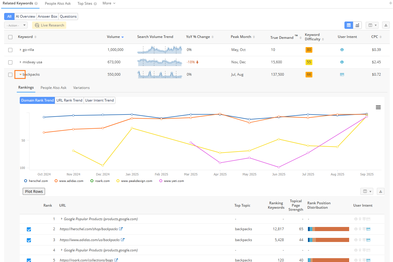 Peak Month: The months within the displayed date range when Search Volume was at its highest. This may include up to three months if multiple periods had similarly high search volume. True Demand™: seoClarity's own estimate of the average monthly searches for a keyword based on clickstream data. Keyword Difficulty: seoClarity's proprietary score that measures how hard it is to rank for a keyword based on the strength and topical authority of the pages currently ranking.