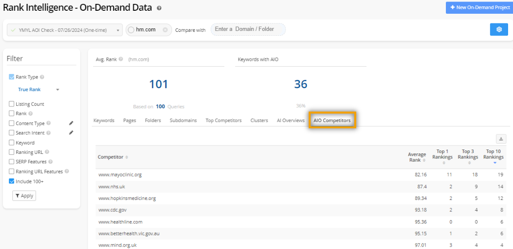 Rank within Feature: The position of your domain among the sources in the AI Overview. If your domain was not included, this will show 100+ (i.e., not ranking)
