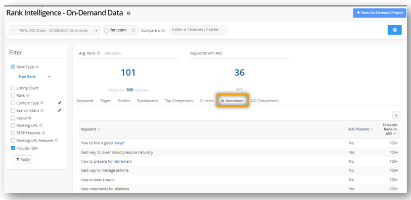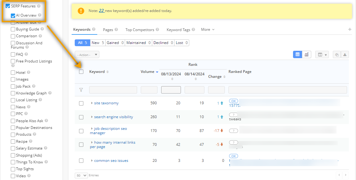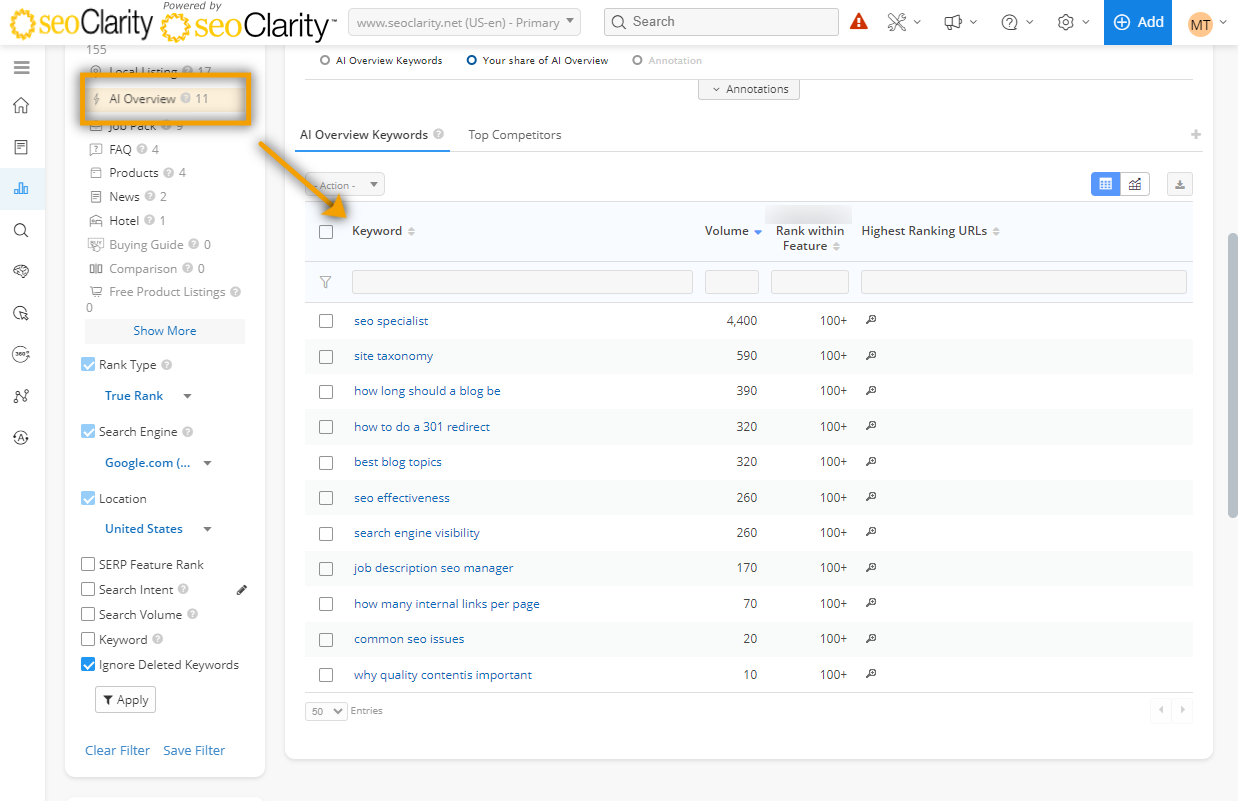 Rank Intelligence Keyword Rankings shows any of your managed keywords that displayed an AI Overview during your current date range when the AI Overview SERP Features filter is activated.