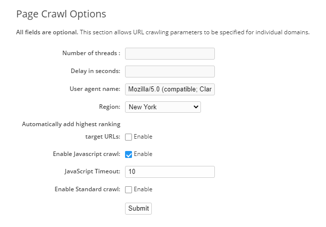 This section allows crawling parameters to be specified for all managed pages (those found in Page Clarity). This includes the ability for optional parameters.