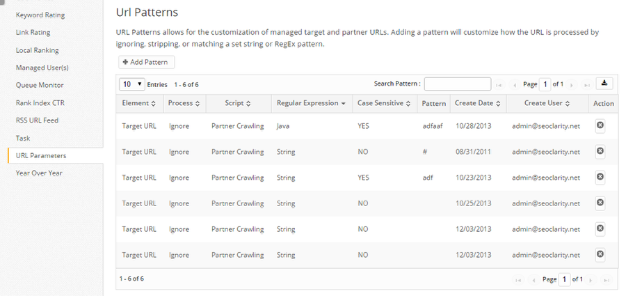 URL Patterns allows for the customization of managed target pages (Page Clarity) and partner URLs (aka backlinks in Link Clarity). Adding a pattern will customize how that type (Target or Partner) of URL is processed by ignoring, stripping, or pattern matching. This is helpful for analytics feeds or backlinks that include many tracking parameters.