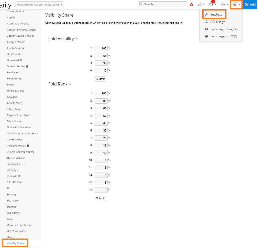 The Visibility Share settings allows for customized percentages for fold visibility and fold rank.