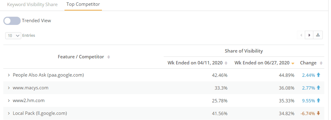 Top Competitor: This table displays top ranking competitor domains based on the tracked keyword set with their Visibility and Wtd. Pixel Rank metrics. Trended View can be toggled on to view a single metric trend. Notice that unlike traditional competitor views, Visibility Share includes the search features that most often compete with your results.