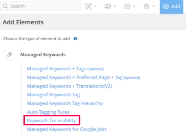 Keywords need to be added to the platform as managed elements for related data to be viewable. Visibility Share is available to eligible accounts as a paid upgrade. Data is based on the first search engine results page and is available on a weekly basis. Desktop fold is based on the screen size of 1028 x 765 and mobile fold is based on the screen size of an iPhone 10 (5.8 inch).