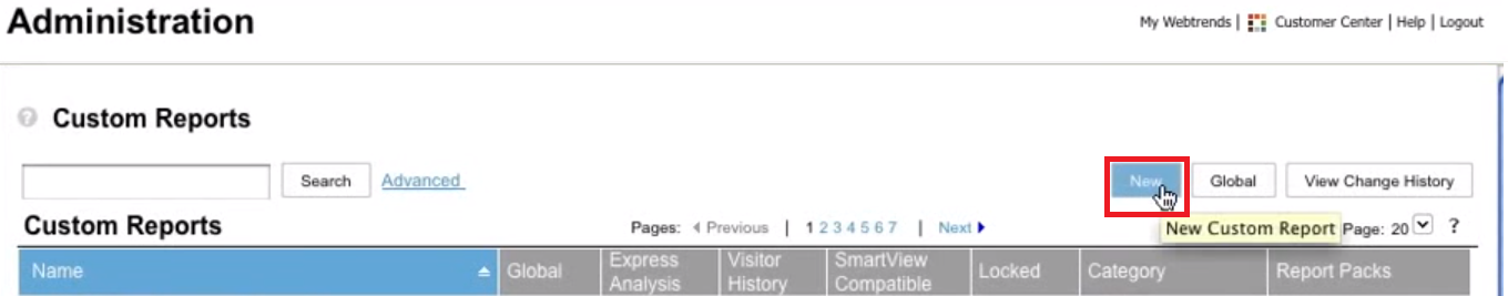 1) Log into your Webtrends account and navigate to Custom Reports in Web Analysis > Report Configuration > Custom Reports to configure the report.