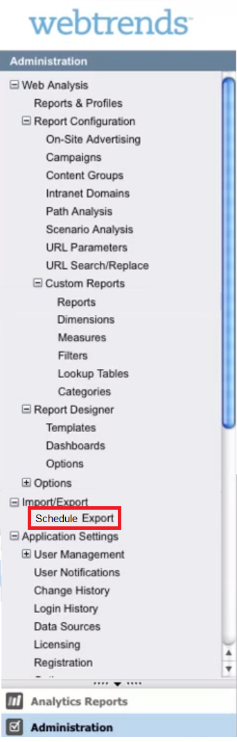 9) Now that you have created the report navigate to Schedule Export on the Export Reports menu. Import/Export > Schedule Export