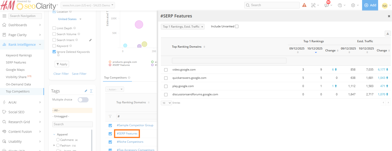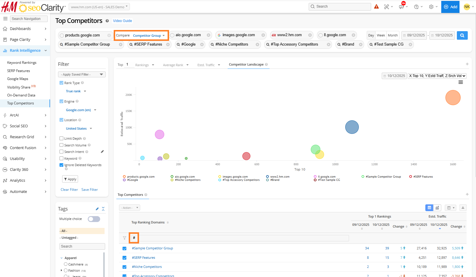 Top Competitors report that allow domains to be manually grouped together for the purpose of viewing performance for that collection of domains. Competitor domains can only belong to one competitor group at a time and up to 30 competitors can be placed in a single competitor group. Historical data will update according to the domains currently in the group and does not require backprocessing.
