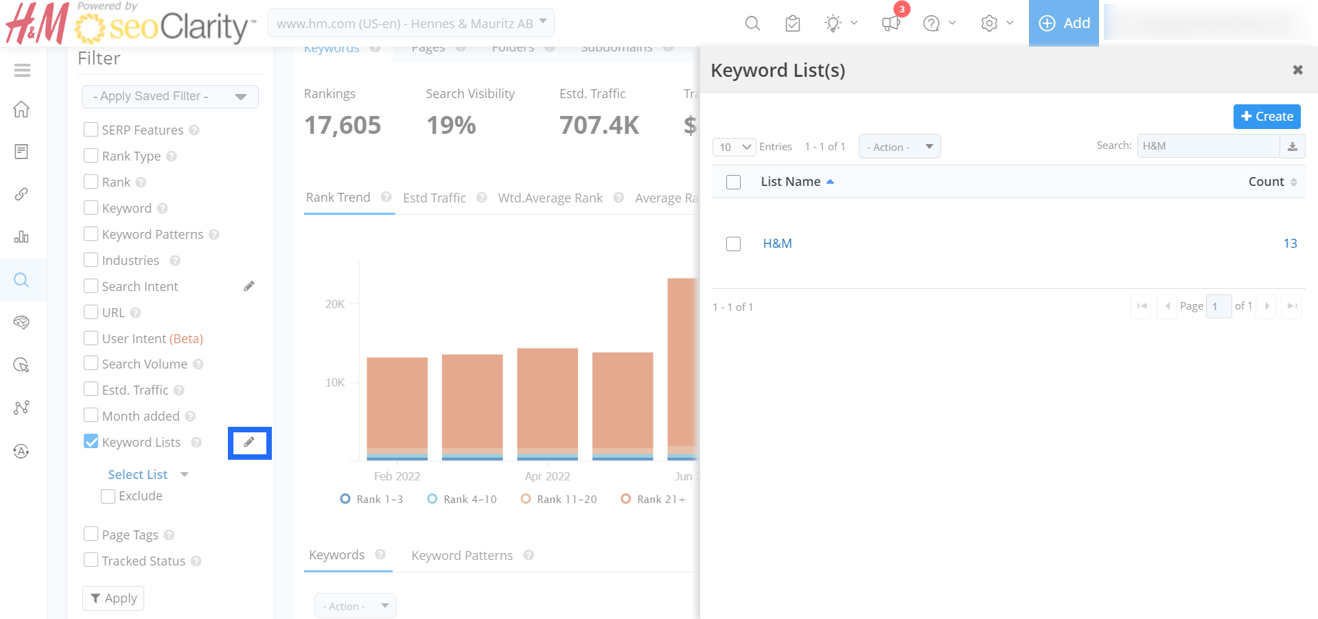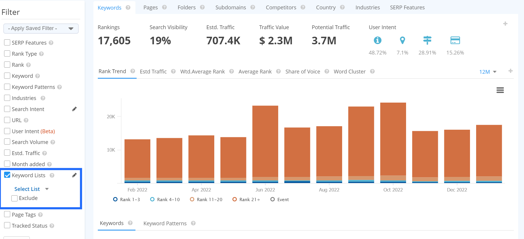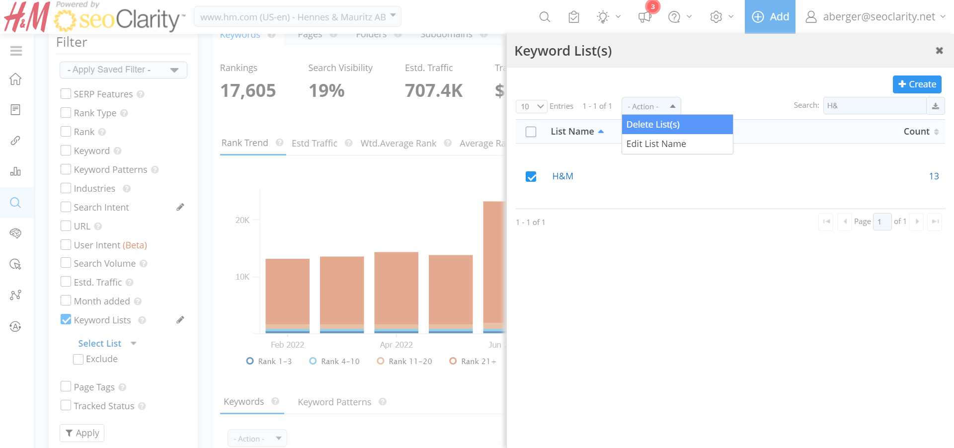 Keyword Lists are a way to organize keywords from the Research Grid or Search Analytics into groups for filtering. This allows for the creation and use of keyword lists across different features of the Research Grid & Search Analytics.