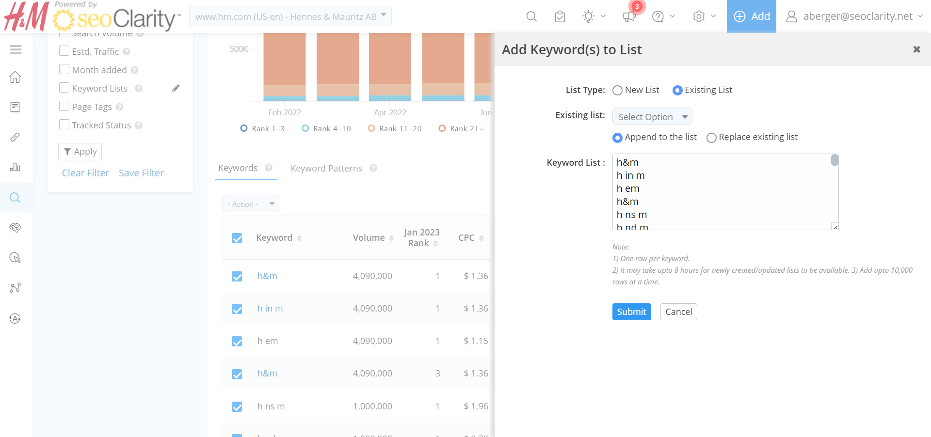 You also have the option to add keywords to existing and create new lists directly from Topic Explorer, Research Grid > Domains, and Search Analytics:
