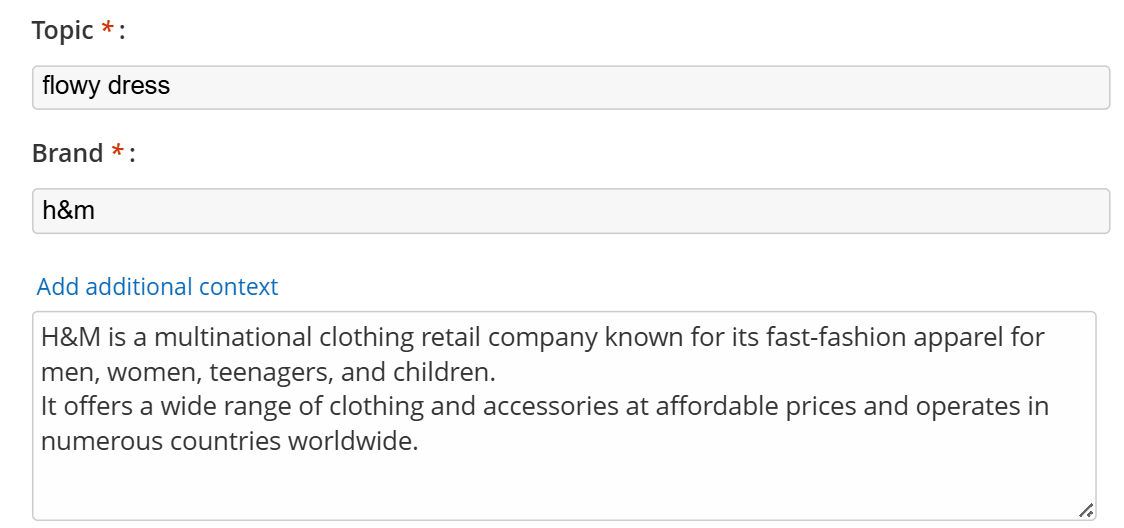 When you select "Add additional context" after entering a brand, the system will automatically suggest some context for you. Feel free to review and edit this text to make sure it truly reflects your business or topic. The more specific and clear your context, the better the AI can tailor the questions to fit your needs.