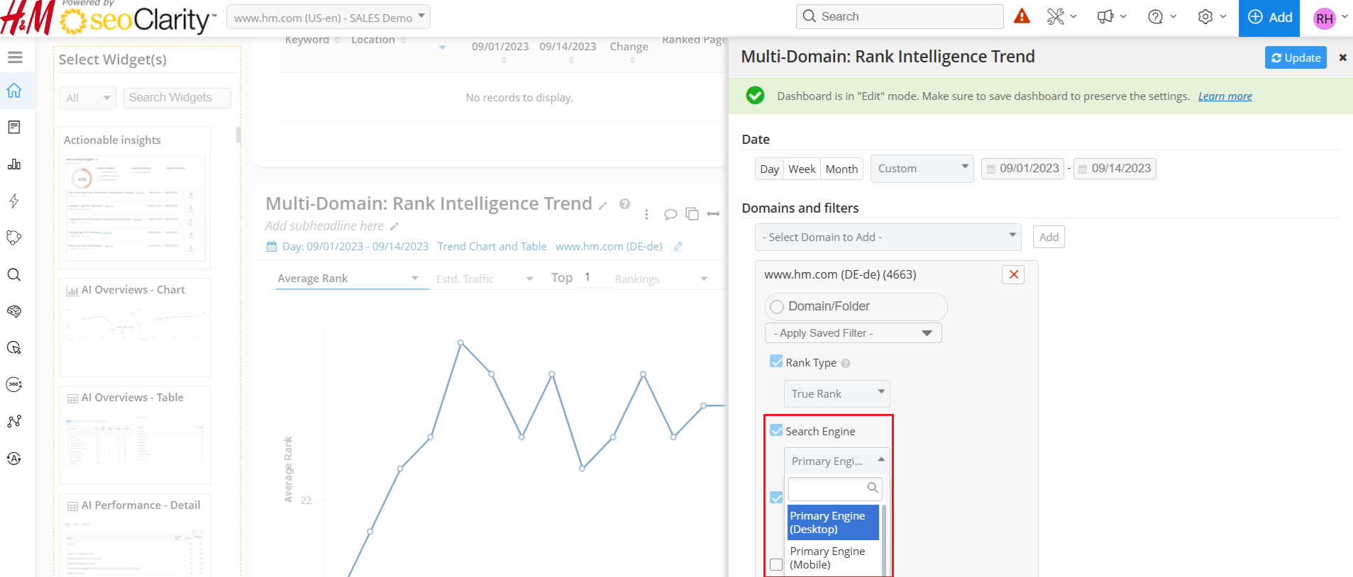 Throughout the platform, when selecting the search engine you wish to view data across via multi-domain widgets, you may see options such as Primary Engine, Primary Google Mobile, Google & Google Mobile. Depending on the provisioning of a profile, these options may have significant differences. The Primary Engine options will be the default search engines seen in Rank Intelligence for a domain profile. As an example, the Primary Engine could be Google Desktop, Google Mobile, Baidu Desktop, Baidu Mobile, etc.