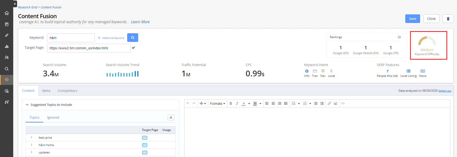 Keyword Difficulty in seoClarity is based on a proprietary algorithm using everything we know about a particular keyword and the pages that rank for it. Leveraging our Research Grid data set, we first calculate Topical Page Authority (how strong a page is for each of the topics it ranks for) based on its visibility in the SERPs, the intent of the keyword, the intent of the page, the intent of other pages ranking for the keyword and other common SEO data points. This is then used to determine how difficult the current incumbents would be to beat based on how closely their topical authority aligns with the keyword and their strength on the topic