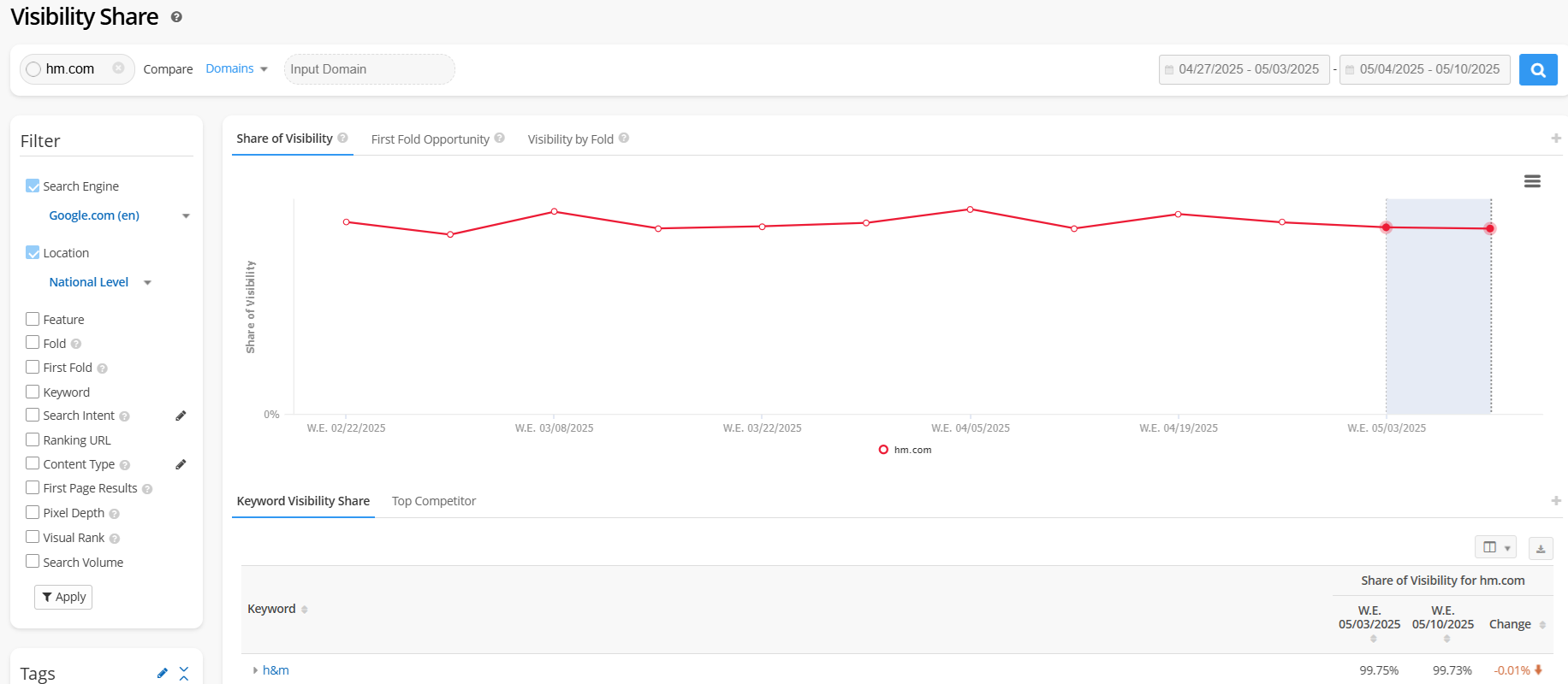 Visibility Share feature, representing the relative organic visibility of a web ranking result, that is calculated based on the pixel depth weighted by the first fold opportunity. The higher the percentage, the more visible a ranking is on the SERP. A Share of Visibility of 100% means the ranking position is at the top of the page with nothing above it. This is the best metric for comparison between keywords with competitors. Appearance in SERP Features, like local results or otherwise, are not included in this.