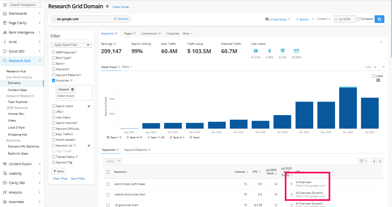 When viewing AI Overview ranking performance via the aio.google.com friendly domain profile, the title "AI Overview Dynamic" means our crawler sends an additional request to get the content and links from the AI Overview; whereas the "AI Overview" title means the content and links are directly accessible without the need for another request. The example pictured below comes from
