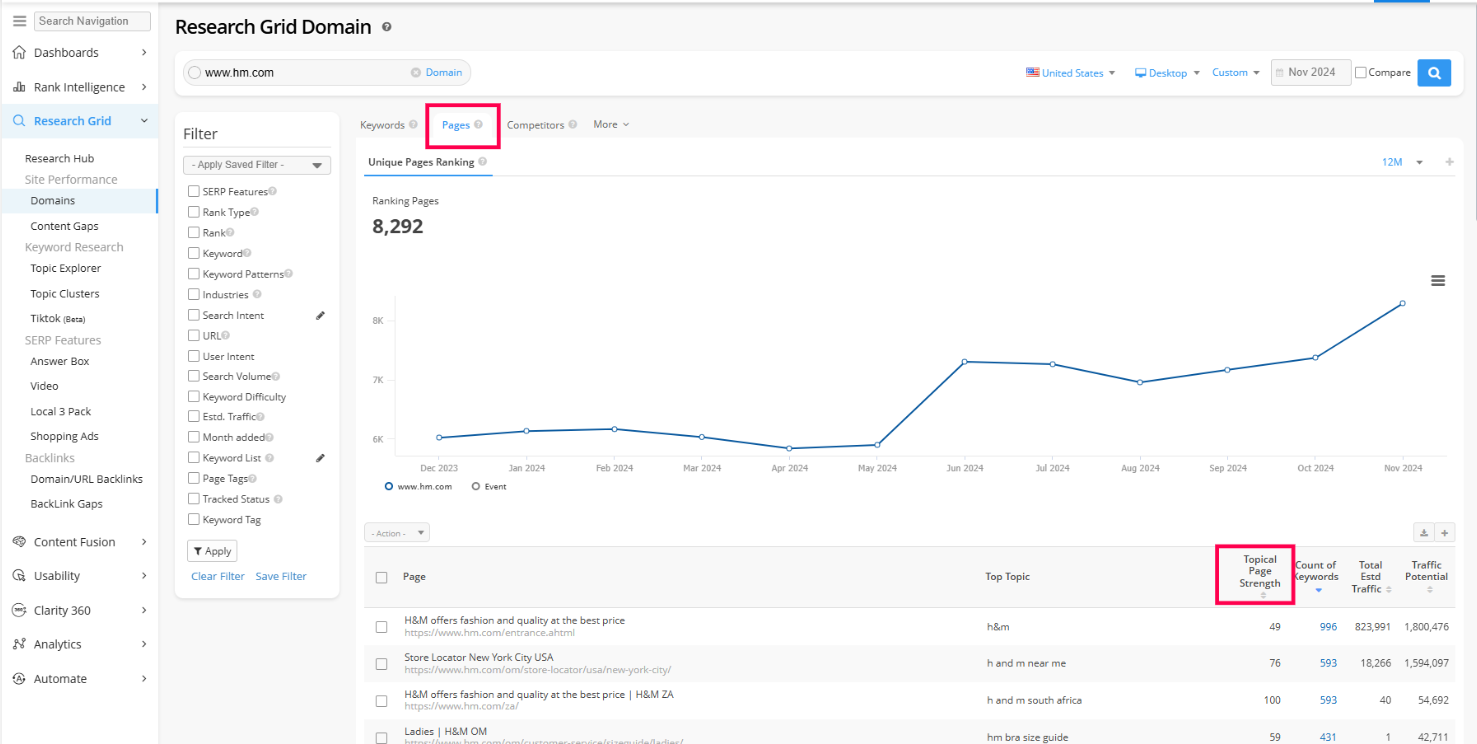 Topical Page Strength is a seoClarity metric that evaluates how strong a single page is contextually for that particular topic. It's algorithmic determination leverages every data point in seoClarity’s Research Grid dataset: keywords, search volume, volatility, SERP features, backlinks and on-page content, and applies sophisticated AI to calculate the page strength of every one of the tens of billions of pages across 90+ countries.