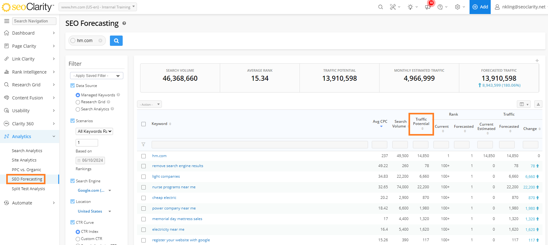 SEO Forecasting Overview SEO Forecasting (formerly Traffic Potential) is a forecasting feature that allows you to project future performance based on variable driven scenarios using keyword ranking data. Similarly, it can be used to compare ...
