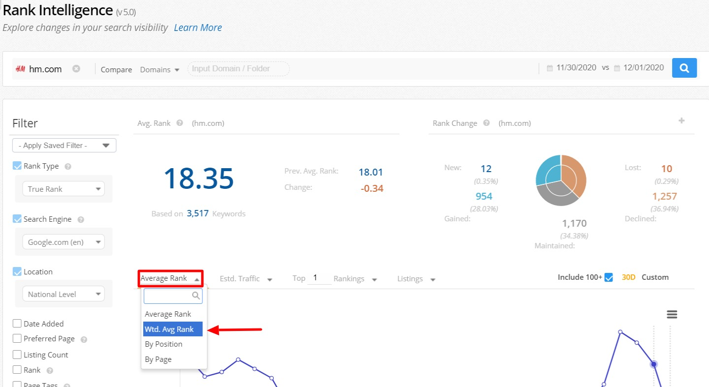 The Weighted Average Rank is a calculation used to help give a more accurate Average Rank for a group of keywords. This calculation seeks to improve upon a standard average rank by taking search volume for each keyword into account as a weight. Weighted Average Rank paints a more accurate picture of performance and highlights where there is room for growth. The nature of this weighting means this metric is available at the domain and tag level, and not at the individual keyword level as it is only weighted against itself.