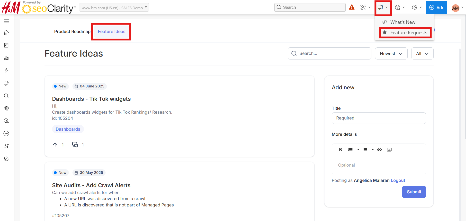 When a feature suggestion is made through the Roadmap Page, the seoClarity product team will tag the suggestion with an internal tracking ID. This allows the team to review the suggestion and prioritize it accordingly. All feature suggestions go through this process, which means a suggestion might not be worked on for weeks or months at a time due to the large demand.