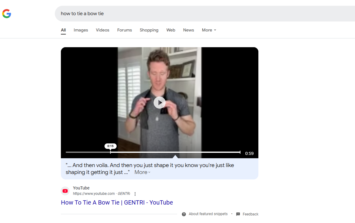 Answer boxes appear at the top of Google's search results page as text, images, videos, lists, or tables. They can typically be seen in results from questions using: how, who, what, where, when, why and can. An example can be seen below for "how to tie a bow tie".