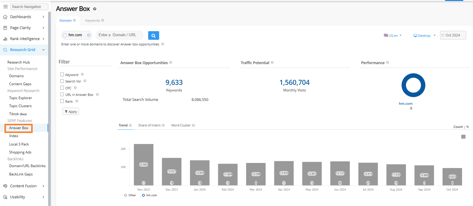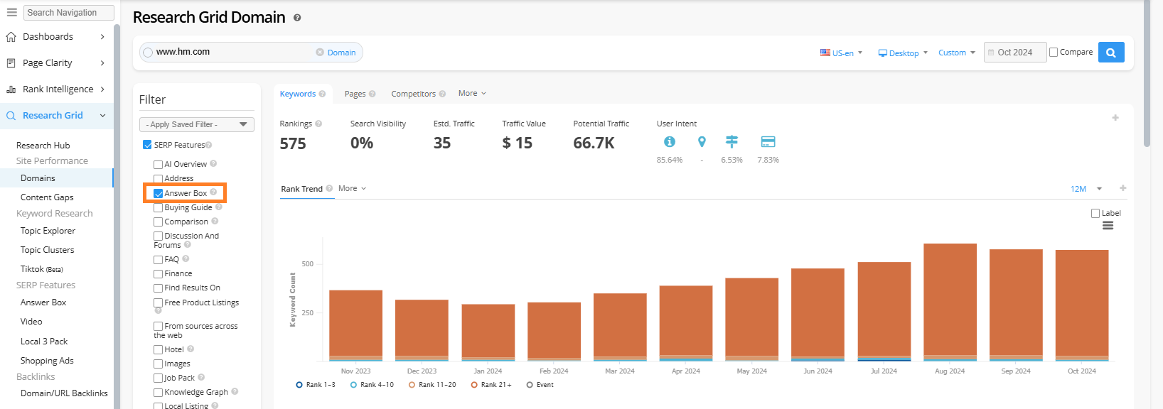 Research Grid allows you to see keywords that trigger Answer Box results based on keywords that domain or URL rank for in our Research Grid. Search for a domain or URL in the Research Grid and select the Answer Boxes checkbox via the SERP features filter. Learn More