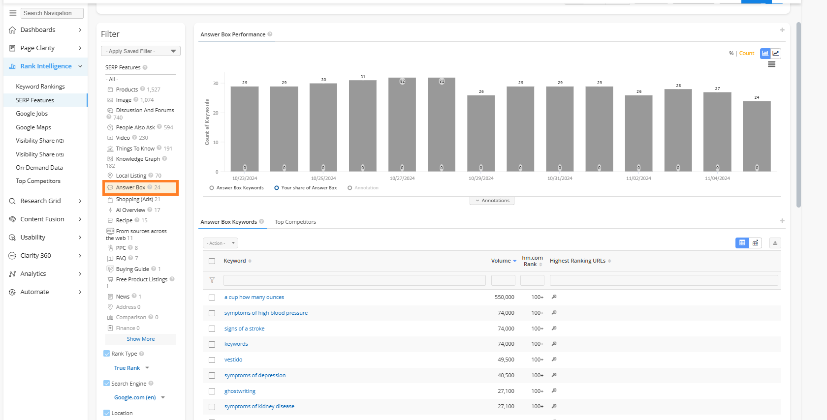 In SERP Features, select Answer Box in the Filter section on the left side of the page. Once selected the data table will populate with keywords that trigger a SERP that includes an answer box based on your managed keywords.
