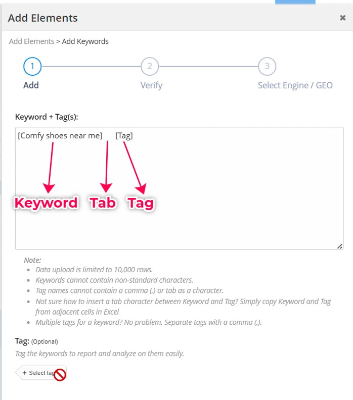 separated by a tab. If your keyword already has a tab, the system sees it as having an existing tag association. Because of this, the platform won’t let you add another tag to avoid overwriting the current one.