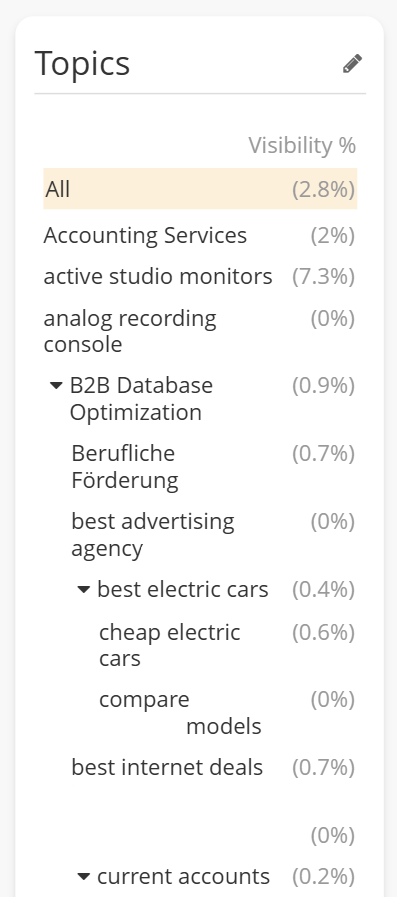 For example, if Topic A has high visibility with many questions, and Topic B has fewer questions but lower visibility, the AI Search Visibility "All" percent in the Topics box will consider the total questions, not just the average visibility of A and B.