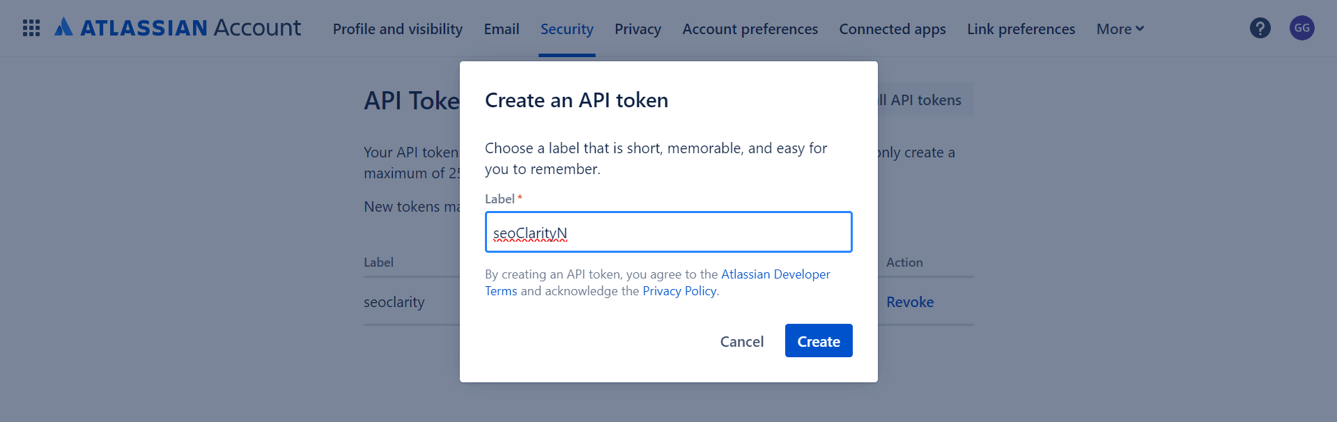 4) Within the Create an API token popup, enter a name to identify the token as being set up for use within seoClarity.