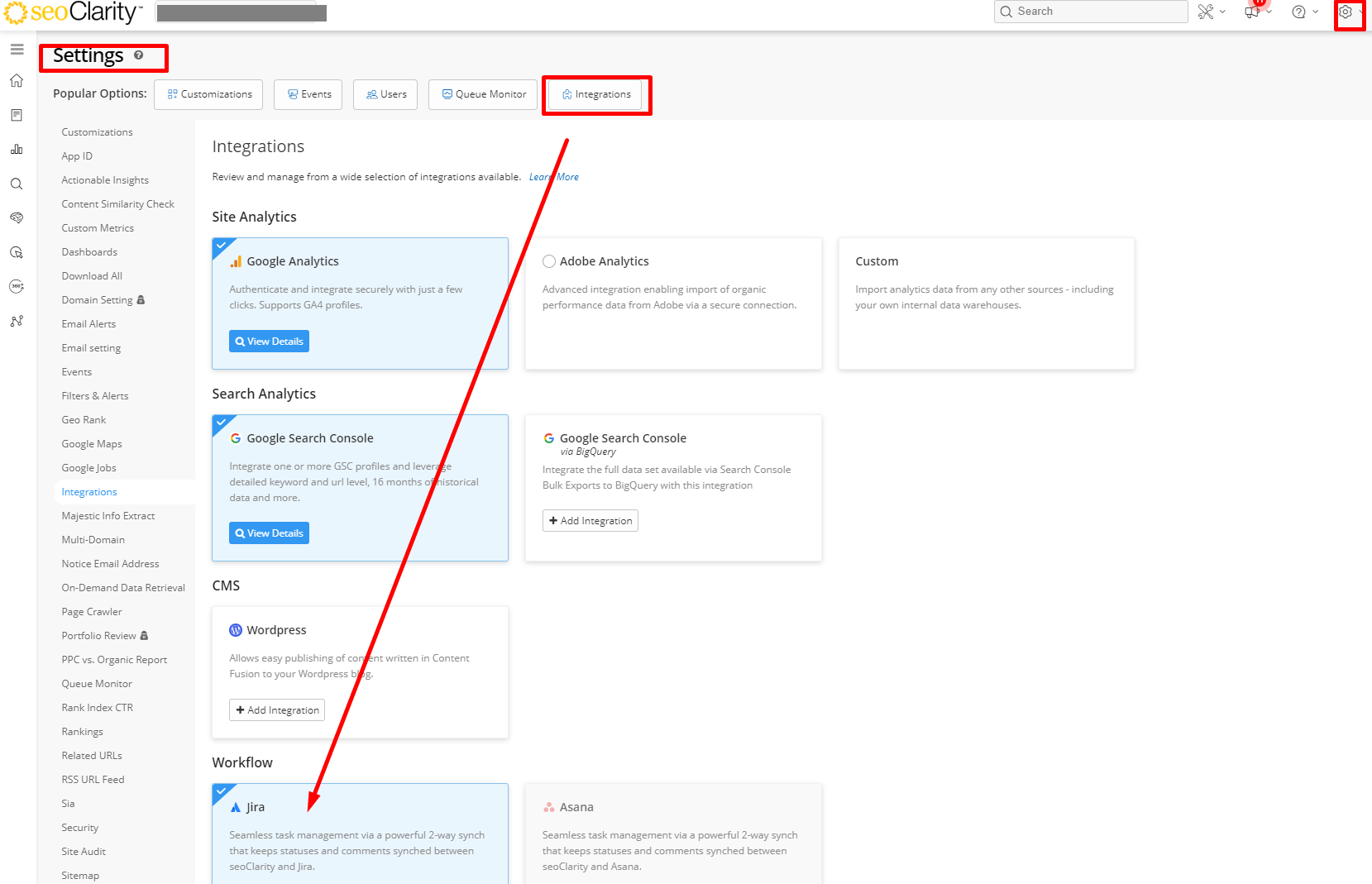Now you can proceed to integrate in SeoClarity. If you are an admin user, you can go to the integrations tab: