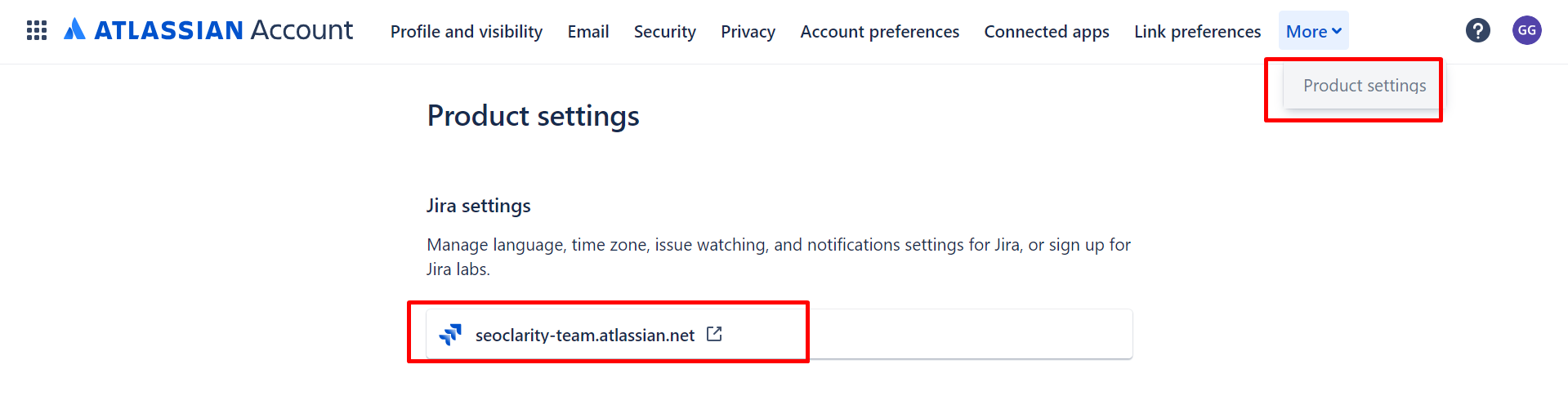 - Atlassian site. When you created your Jira account, you assigned a name to your site, use the same here. If you don't remember the name you can grab it from your browser once you are logged in Jira, or go to the main Menu>More>Product settings